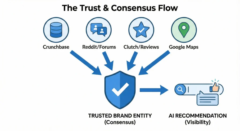 If a brand claims authority on its website but is not supported by platforms like Crunchbase, Clutch, LinkedIn, or real user discussions, the AI treats that claim as unverified.